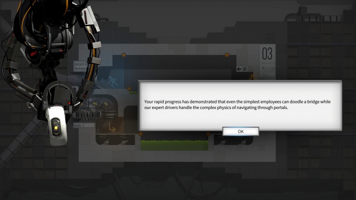 Є тут і свій сюжет. У забавці ви будете новим працівником Aperture Science, якому потрібно будувати мости, пандуси, портали, розмащувати гель, ставити батути, а також багато іншого для транспортування людей через аварійні камери лабораторій.