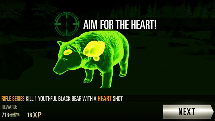 Ну і власне полювання. Тут ми проходимо основну, скажем так сюжетну лінію. Виконуючи певні завдання, типу вбити лося поціливши у серце, або ж алігатора пострілом у легені, ми отримуємо досвід та гроші. Поруч є контрактні завдання для автоматичної зброї, та рушниці. Ну і спец завдання які по суті нічим не відрізняються від основних, але платять тут в рази більше. Для вдалого полювання нам потрібна відповідна зброя, тож спочатку варто модернізувати стою гвинтівку, збільшивши потужність, стабільність, і таке інше. Власне саме для цього нам і потрібні гроші.