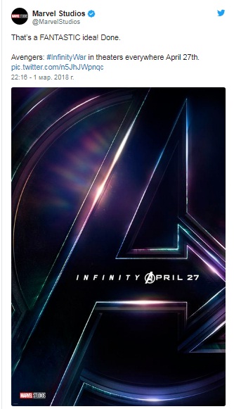 Кіностудія Marvel така непостійна, змушує шанувальників своєї творчості бігти то вліво, то вправо. Ось цього разу на світ гучно пролунала новина, що прокатний графік фільму «Месники: Війна нескінченності» потерпів змін. Як повідомляє видання ComicBook з посиланням на офіційний прес-реліз, американські глядачі зможуть переглянути картину не з 4 травня 2018 року, як планувалося раніше, а з 27 квітня того ж року.