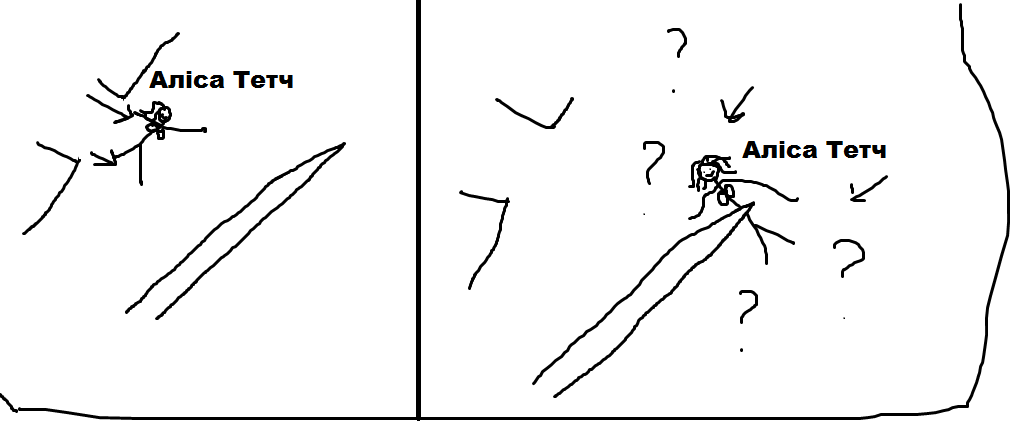 - Капітан Барнс заражається кров’ю Аліси Тетч, і хто б міг подумати, яким чином. Він стає прямісінько над тією залізною трубою, на якій якогось чорта залишилась одна єдина краплина крові дівчини, і саме коли він вивертає голову вгору, та краплина злітає із труби прямо йому в око. Це ж треба, який збіг обставин!